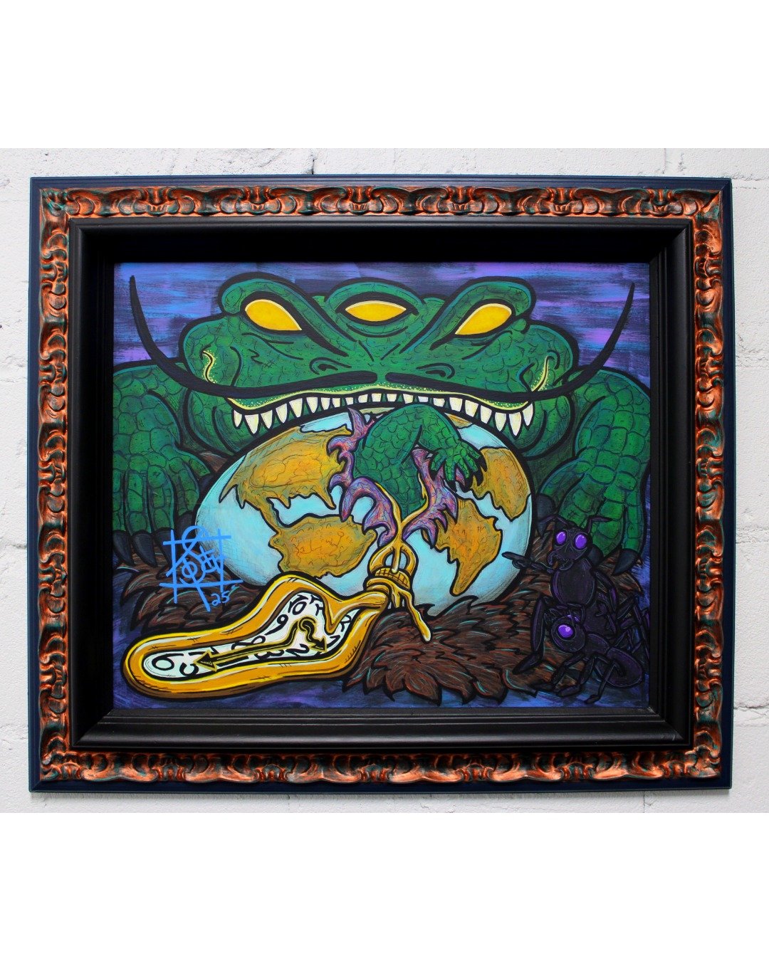 This Dali painting is a very dark & muted piece, so I felt I needed to match that aesthetic. I kept re-envisioning this painting with a gator egg being watched over like a fierce protective mother gator would . The continents have underlining veins slightly peeking through , adding to the surrealistic appearance of this Florida fever dream. I replaced the two figures from the original with ants as the witnesses of this birth , a common theme in Dalí’s work .